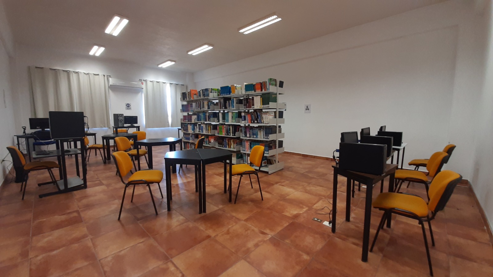 El inmueble aproximadamente mide 51.10m², contando con un área de cómputo con diez equipos que sirven para consulta; cuenta con ocho mesas, iluminación artificial, ocho ventanas, dos sistemas de aire acondicionado, un acceso principal más la salida de emergencia, señalamientos, extintor, colector de basura y servicio de agua para los usuarios.